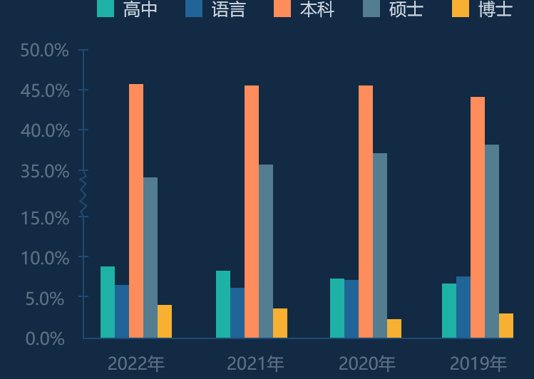从图中可以看出,出国留学依然以读本科和硕士为主力,每年都稳定在80%以上。